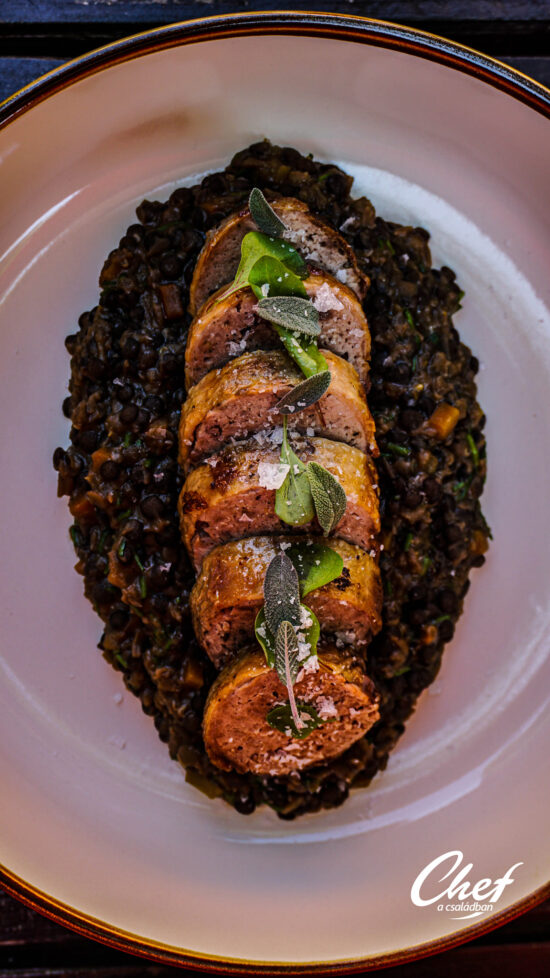 Jól indult a hosszú hétvége: Kacsacomb kolbász bőrébe töltve, kacsalével főtt, füstös-ecetes lencsefőzelékkel.